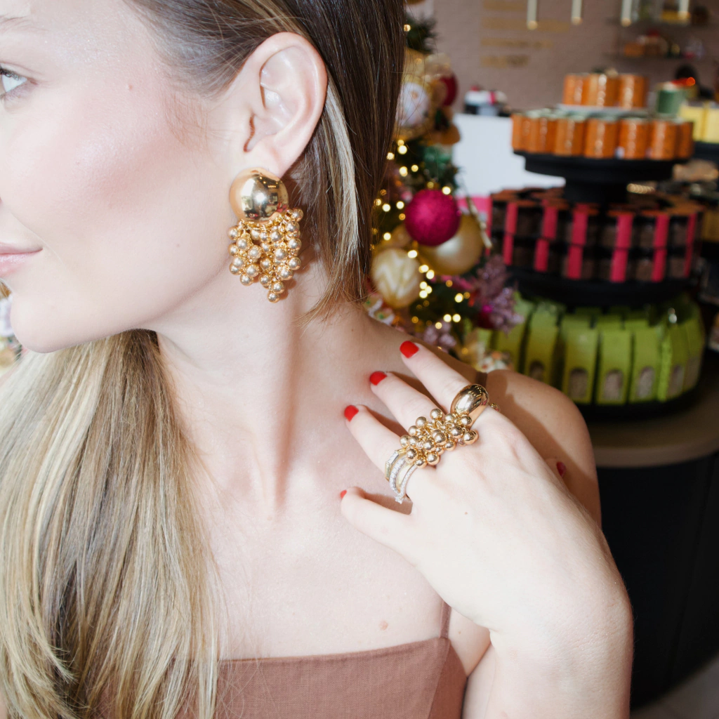 The Shimmy Ring features a smooth base design, adjustable from size 12 to 18, with cascading sphere adornments. (2.5 cm in height for the adornment)