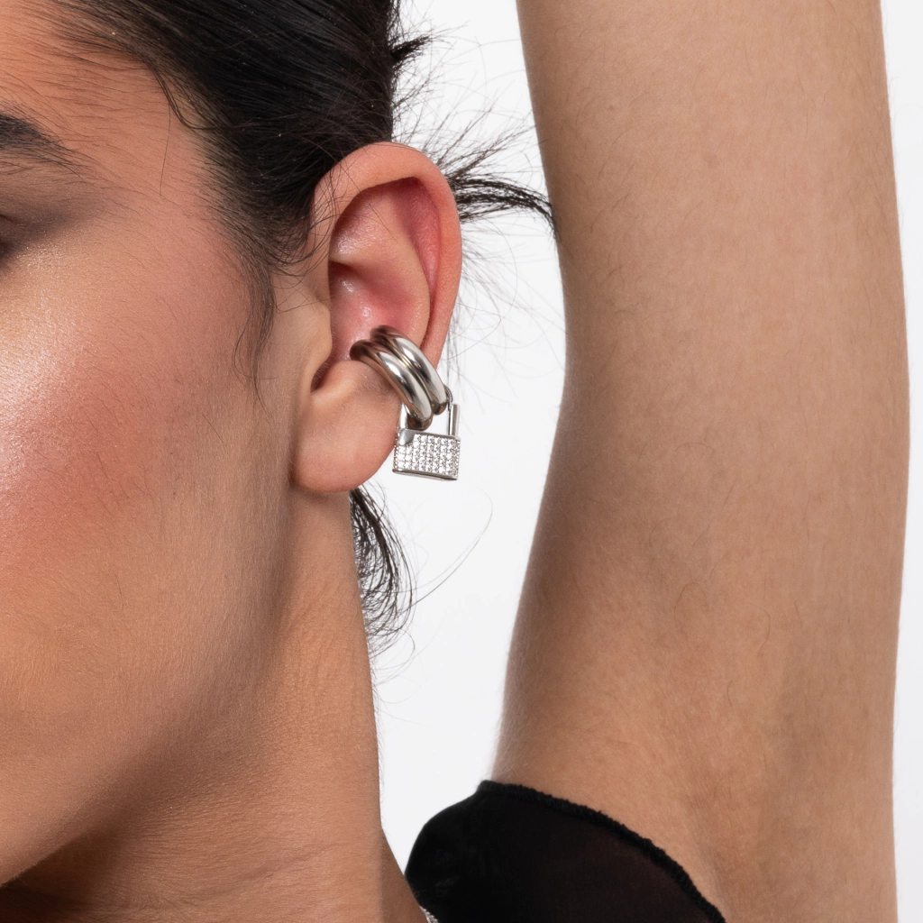 The Lock Paved Hoop Earring features a lock-shaped design paved with zirconia stones. (2.4 cm in height / 1.2 cm in width)