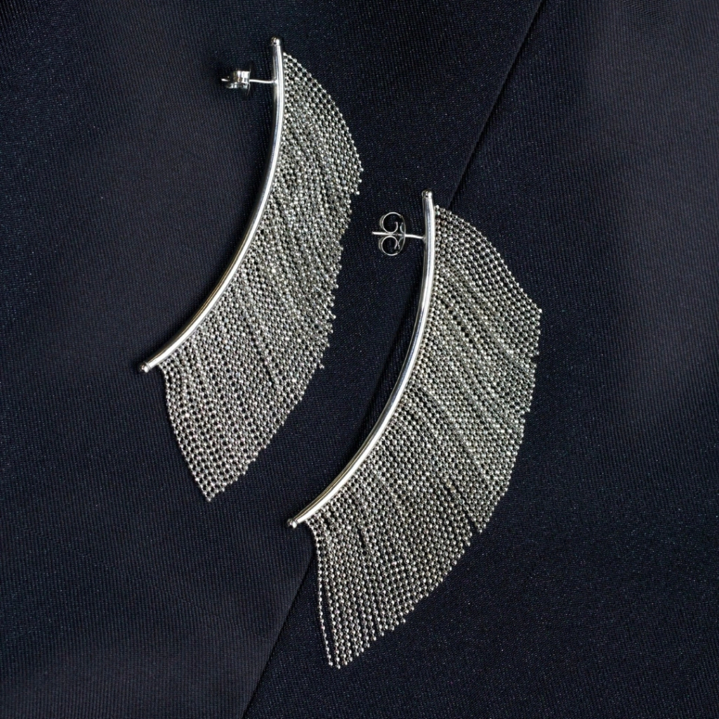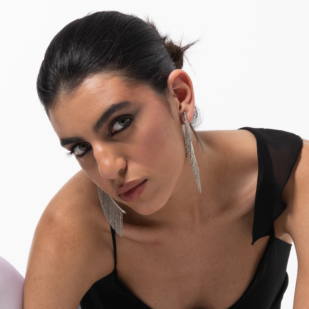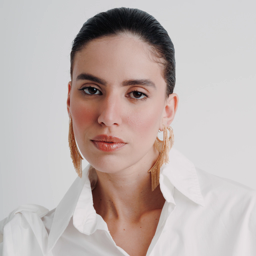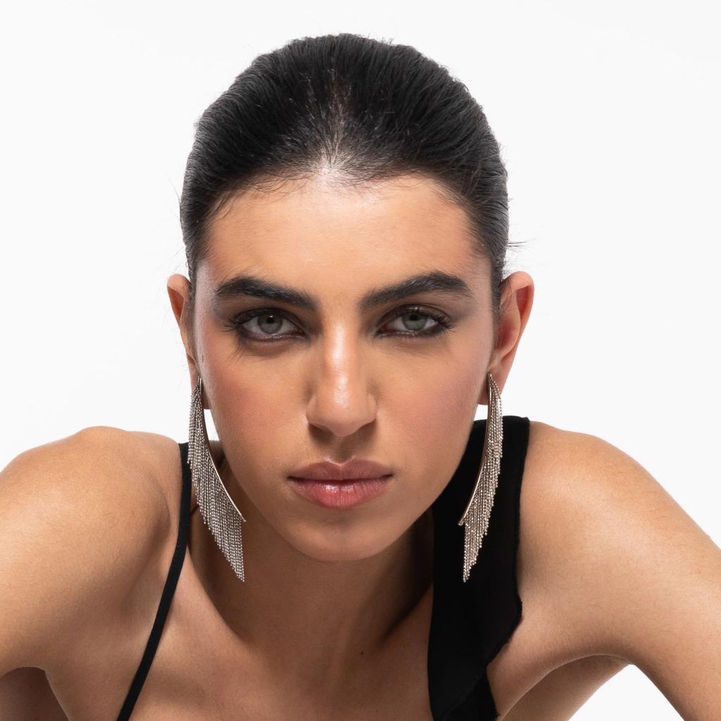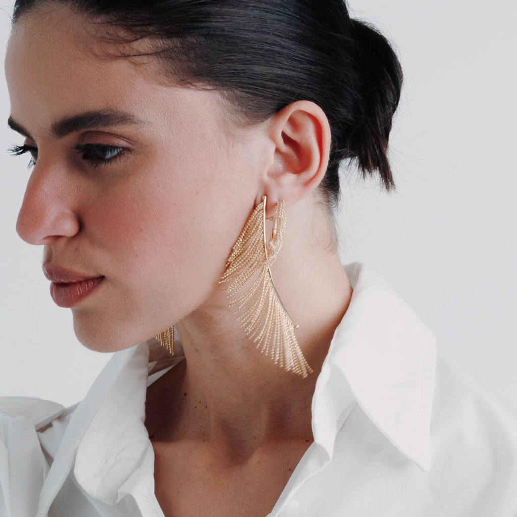 O Brinco Franjas Maxi Boho possui adorno de franjas em malha metálica. Cool e moderno, must-have para o outono-inverno. (7,4 cm de altura / 1,0 cm de largura média quando vestido da forma sugerida)
