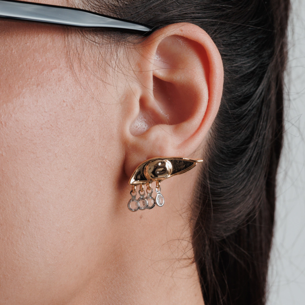 O Brinco Olhos Occhi é um modelo irregular, que assemelha-se ao formato de um olho. Possui pingentes de zircônias de banho diferente. (1,8 cm de altura / 2,7 cm de largura)