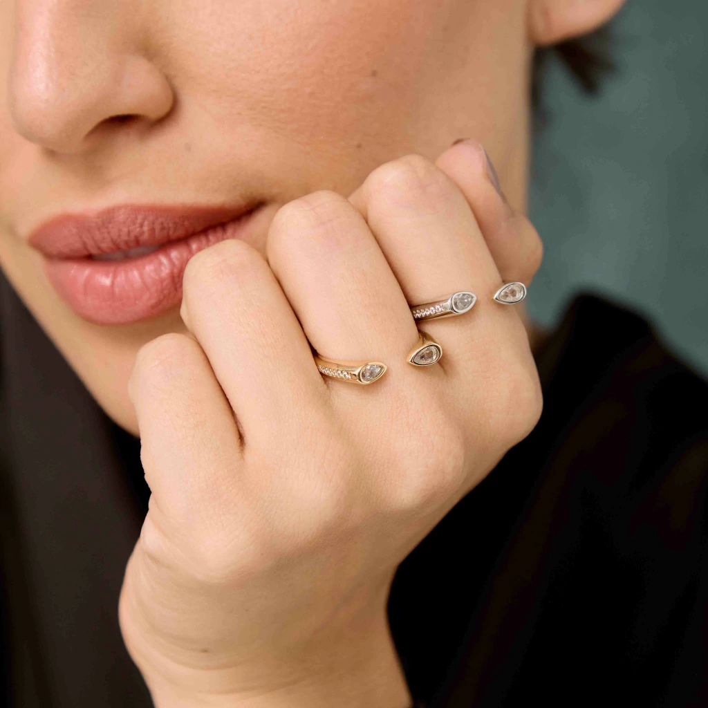 O Anel Drops possui design liso com abertura na parte superior, finalizada com cravação inglesa de zircônias em formato de gota nas extremidades e detalhe de fileira cravejada em ambas as laterais. (0,2 cm da parte inferior a 0,7 cm da parte superior de espessura / cada zircônia gota possui 0,6 cm de altura e 0,4 cm de largura / cada fileira de zircônia lateral tem 0,9 cm de comprimento).