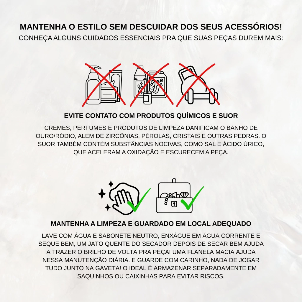 Todas nossas peças são banhadas a Ouro e Ródio Branco e passam por um processo antialérgico.