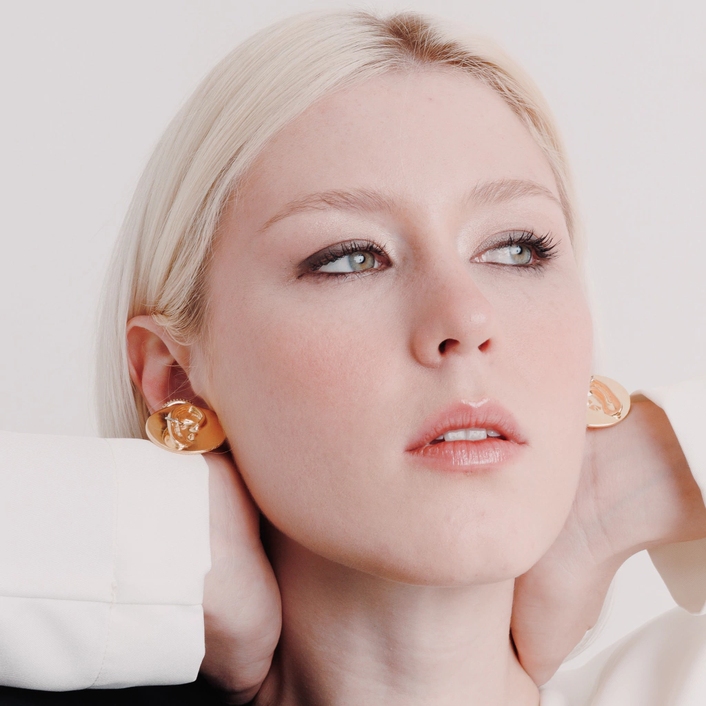 O Brinco Medalha Surreale possui o desenho de uma orelha em relevo, adornada com piercings de tom oposto. Esse é um modelo com design liso e rústico, portanto apresenta uma textura sutilmente irregular em sua superfície; o que adiciona um toque artesanal único. (2,9 cm de altura / 2,9 cm de largura)