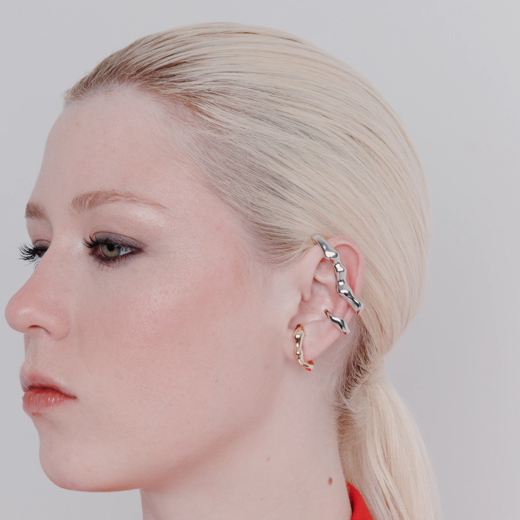 The Chaos Piercing is a model that fits on the top of the ear, featuring an irregular design. No ear piercings are needed to wear it. Please check the measurements, as this model is not adjustable. (4.4 cm in width / 0.8 cm in thickness)